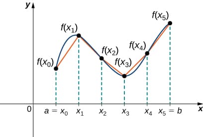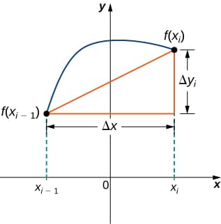 The estimate of the area under the curve would get better and better as \(n \to \infty\). Can we do a similar thing with the arc length (i.e. divide the arc into \(n\) horizontal intervals and add the width of those intervals)? The problem with this is that for any curve, the estimated length will always be \(\lim_{n \to \infty} \Delta x = \int_a^b dx = b-a\). This is clearly wrong. Instead, for \(i=1,2,…,n\), we can construct a line segment from the point \((x_{i-1},f(x_{i-1}))\) to the point \((x_i,f(x_i))\):