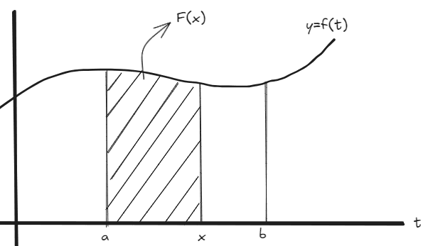 The function \(F(x)\) represents the area under the curve of \(f(x)\) from \(a\) to \(x\), where \(x\) varies between \(a\) and \(b\):