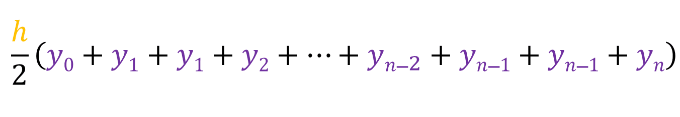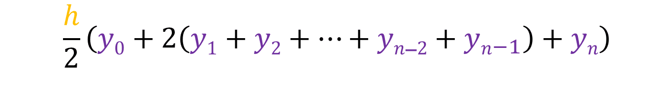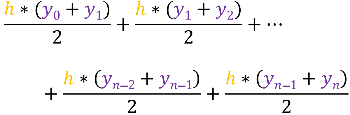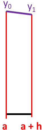 Finding the area of this trapezium will give us an approximate value of the actual area between a and [a + h]. We know that the area of this trapezium is [1/2 * h * (y0 + y1)], then that means the sum of the area of all the trapeziums would be: