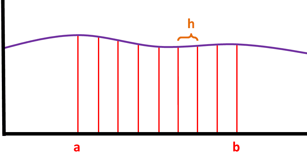 Lets say we need to find the approximate area between a and b so we divided it into n equal strips, where each strip will be of width h: