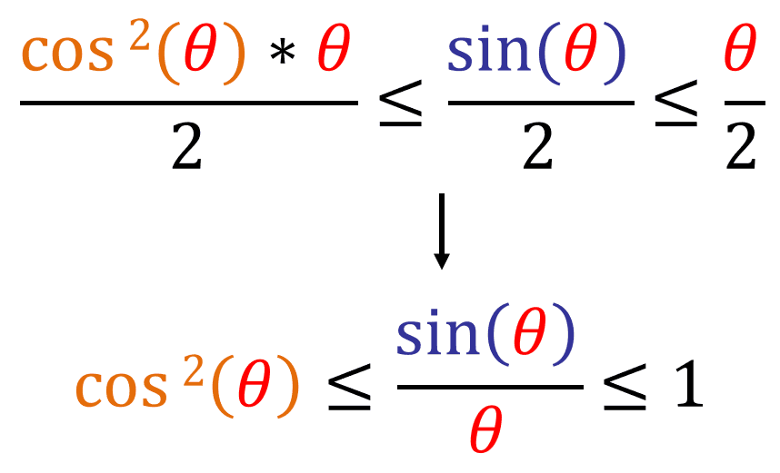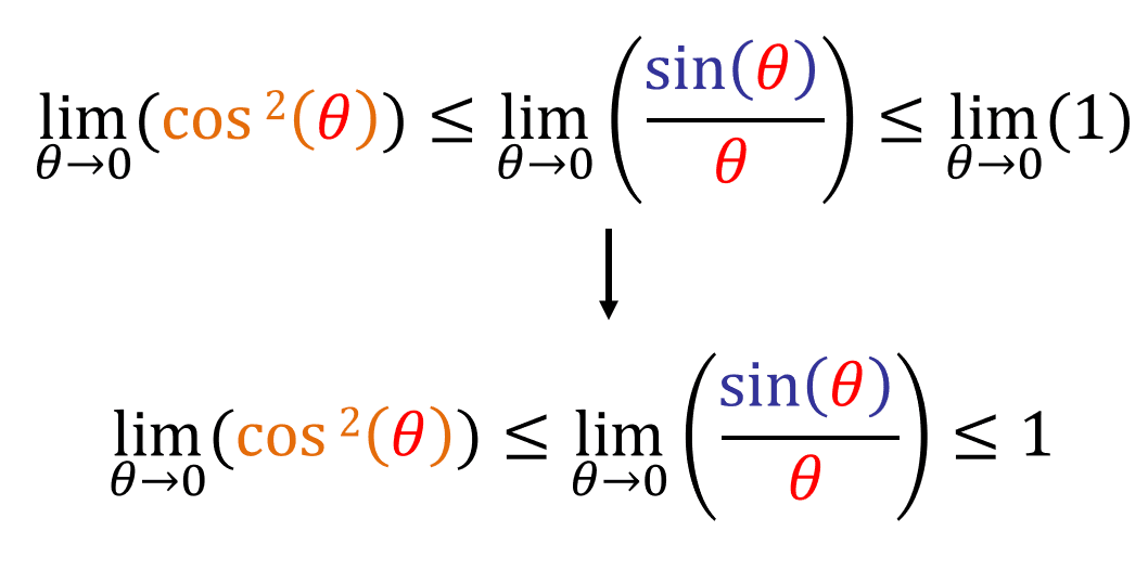 Since [limθ->0 (cos(θ)) = 1], then, by the squeeze theorem, limθ->0 (sin(θ)/θ) has to be 1. Keep in mind that this only works if θ is in radians.
