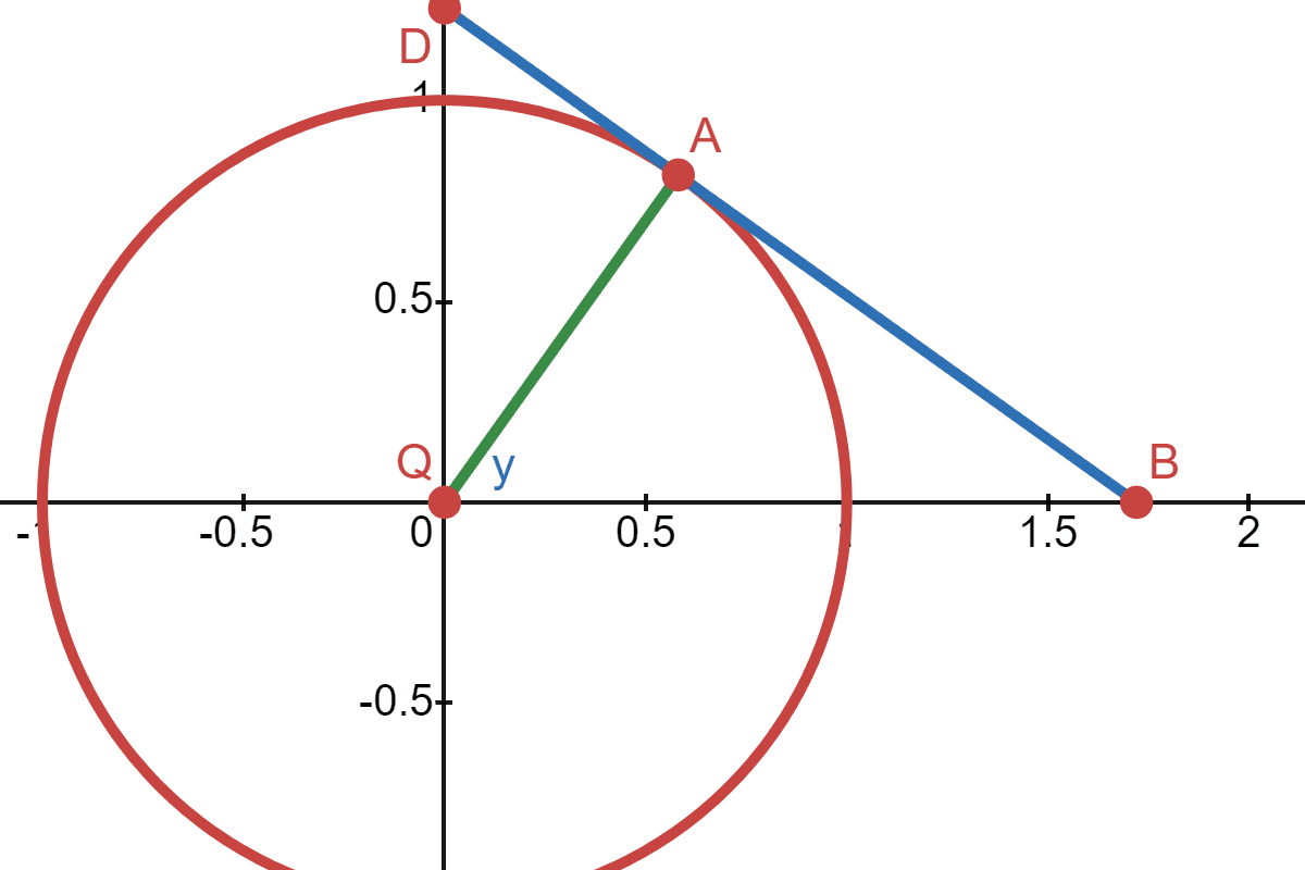 Let \(x\) be the distance from point \(Q\) to \(B\) (which would be negative if on the other side), and let \(y\) be the angle between the line \(\overline{QA}\) and the x-axis.