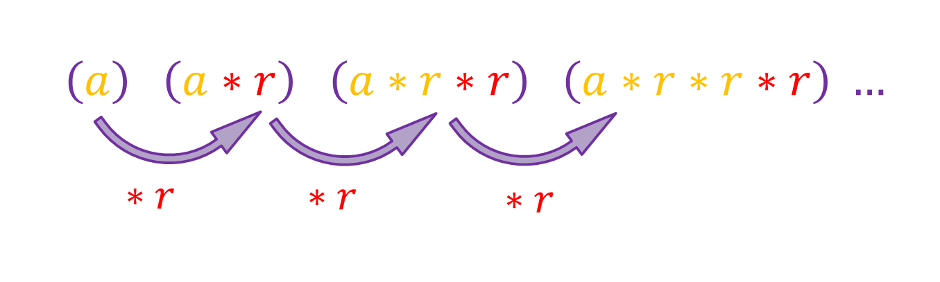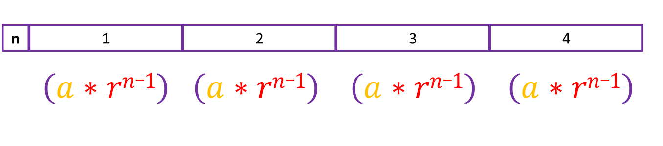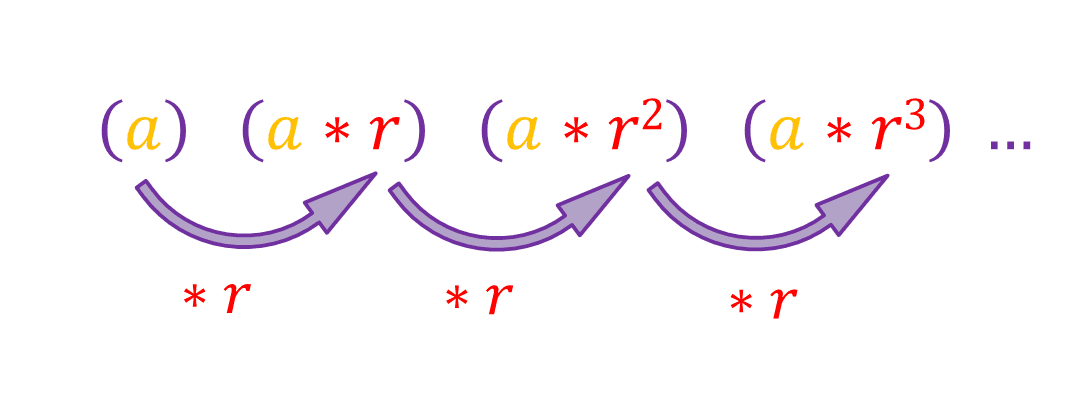 So \([a * r^{n-1}]\) is the formula to use when finding a term in a geometric sequence. In some textbooks, the formula is \([a * r^n]\), this is because they choose the sequence to start with \(n=0\).