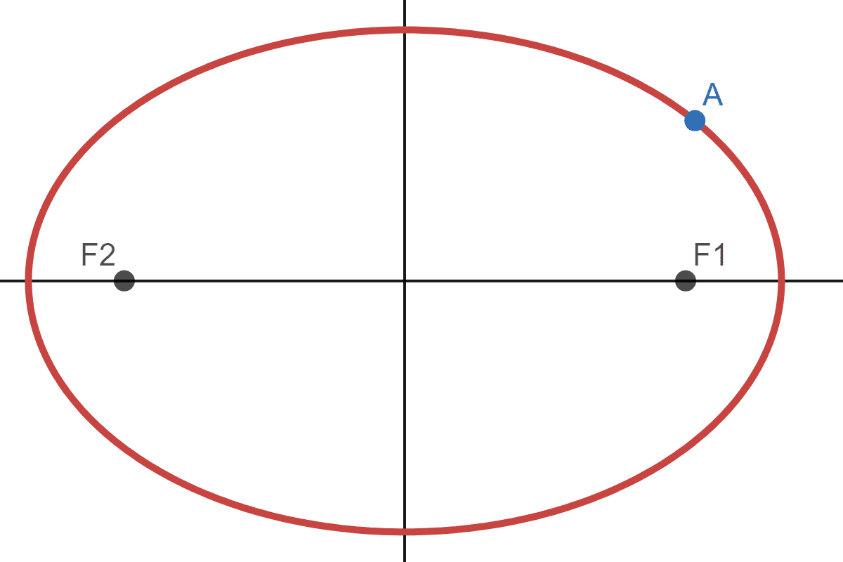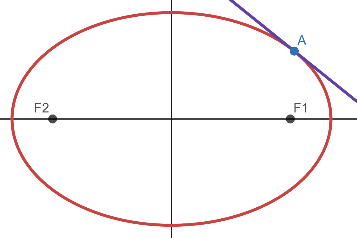 The point \(F_1\) is the left focus while \(F_2\) is the right focus. Now imagine a tangent line at \(A\):