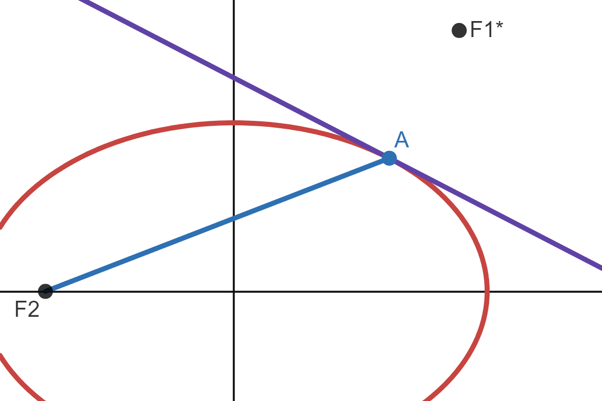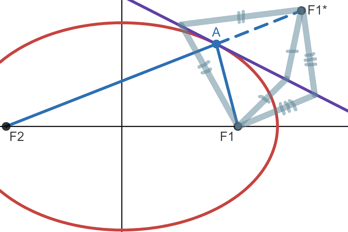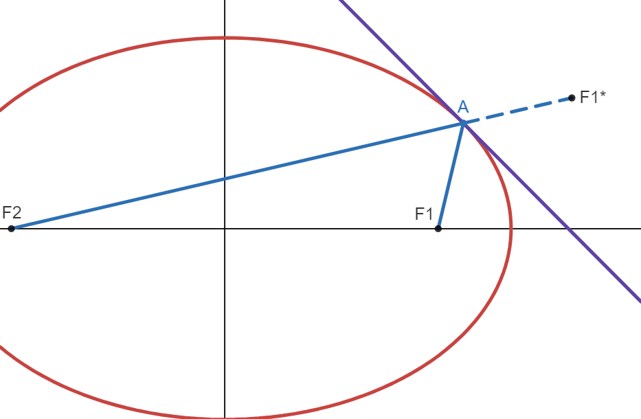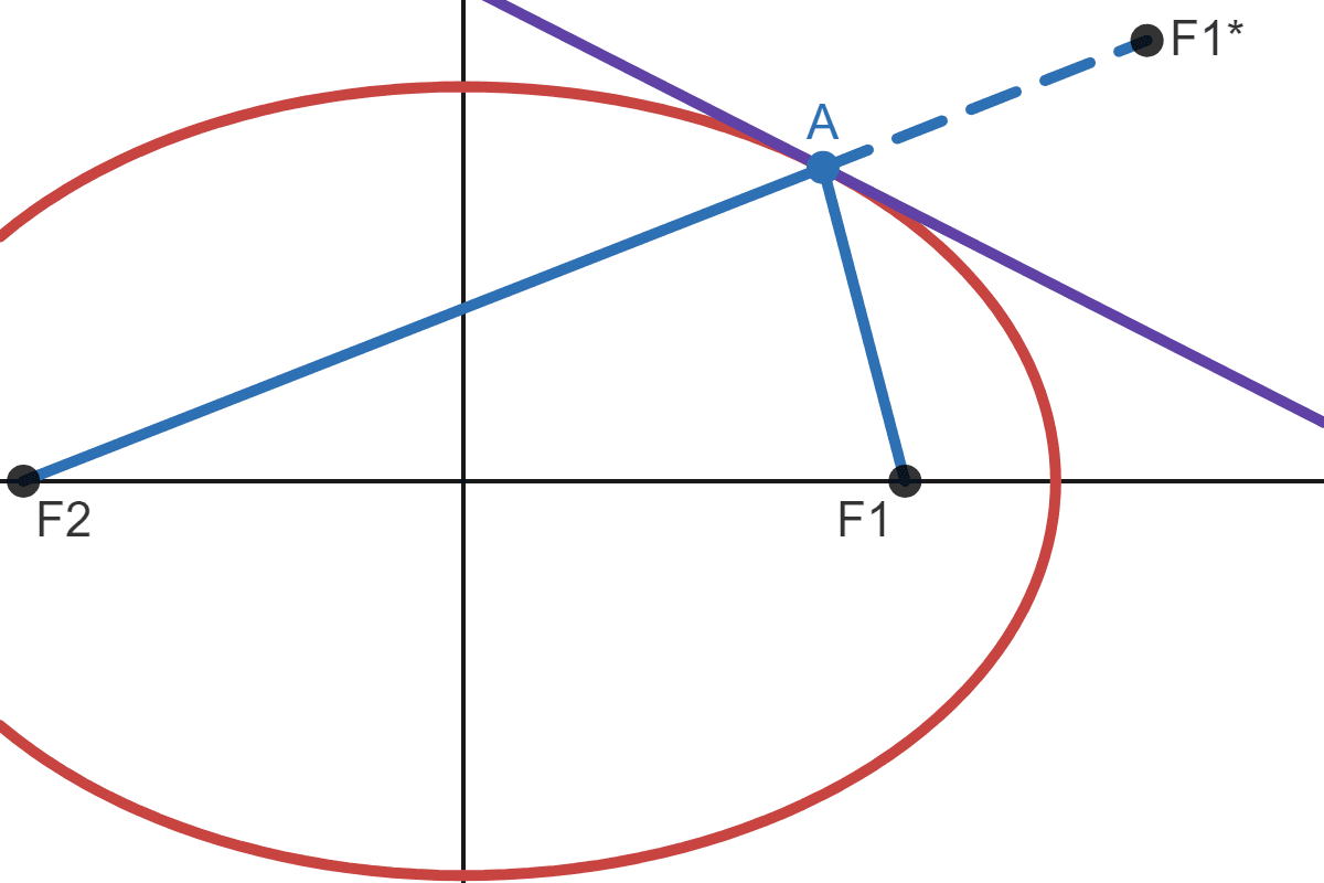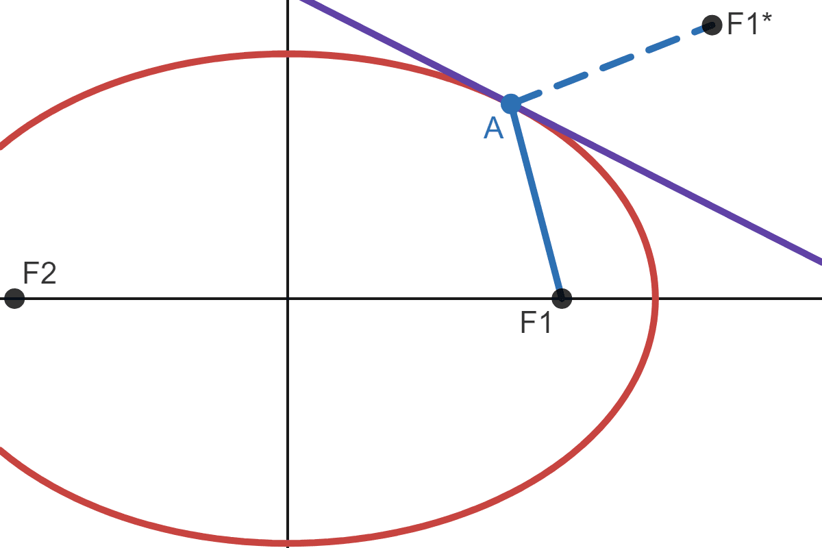 The blue line goes from \(F_1\) to \(A\), and the dashed line is the mirror image of the blue line, so it goes from \(A\) to \(F_1^*\). According to the reflective property, if the blue line is reflected off the ellipse, it should meet the other focus. If that were to be true, then \(F_2\), \(A\) and \(F_1^*\) would form a straight line: