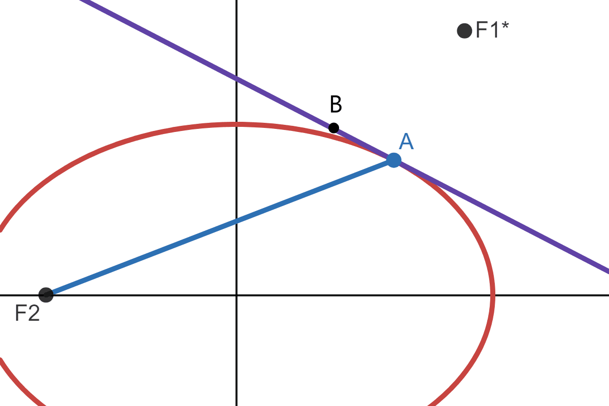 Now let's say that the line \(\Vert F_2 \ F_1^*\Vert\) intersect at point \(B\) where \(B\) lies on the tangent line: