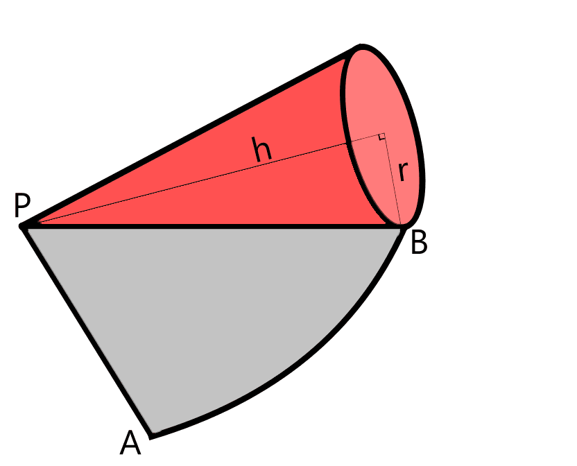 Point \(P\) is the apex of the cone. The cone did one full roll from point \(A\) to \(B\). The gray area represents the region the cone covered during that full roll. This means the arc length of the gray area from \(A\) to \(B\) is the same of the circumference of the cone's circular base. It also means that the surface area of the gray area is the same as the lateral surface area of the cone, so to calculate the lateral surface area, you just have to calculate the area of the gray region.