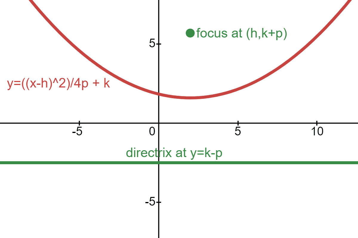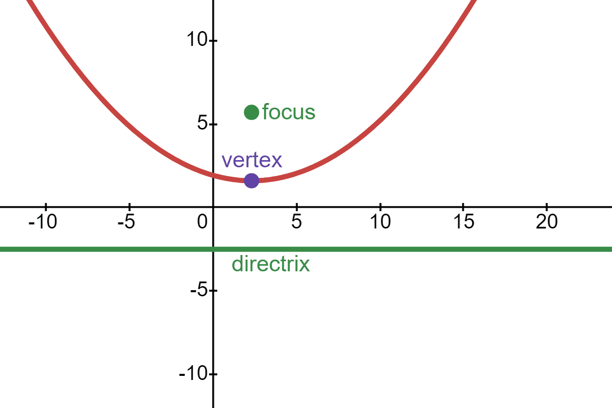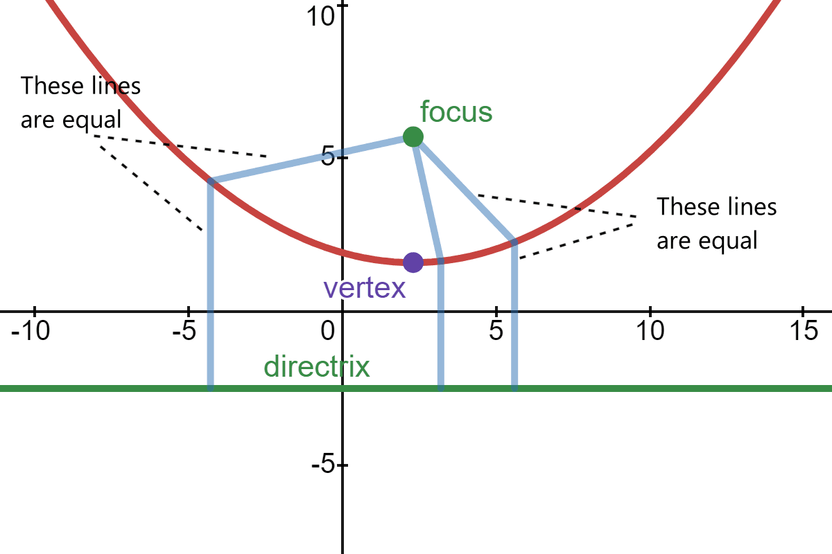 The parabola is defined as the set of all the points that are equidistant from the focus and directrix. The point halfway between the focus and the directrix is called the vertex of the parabola: