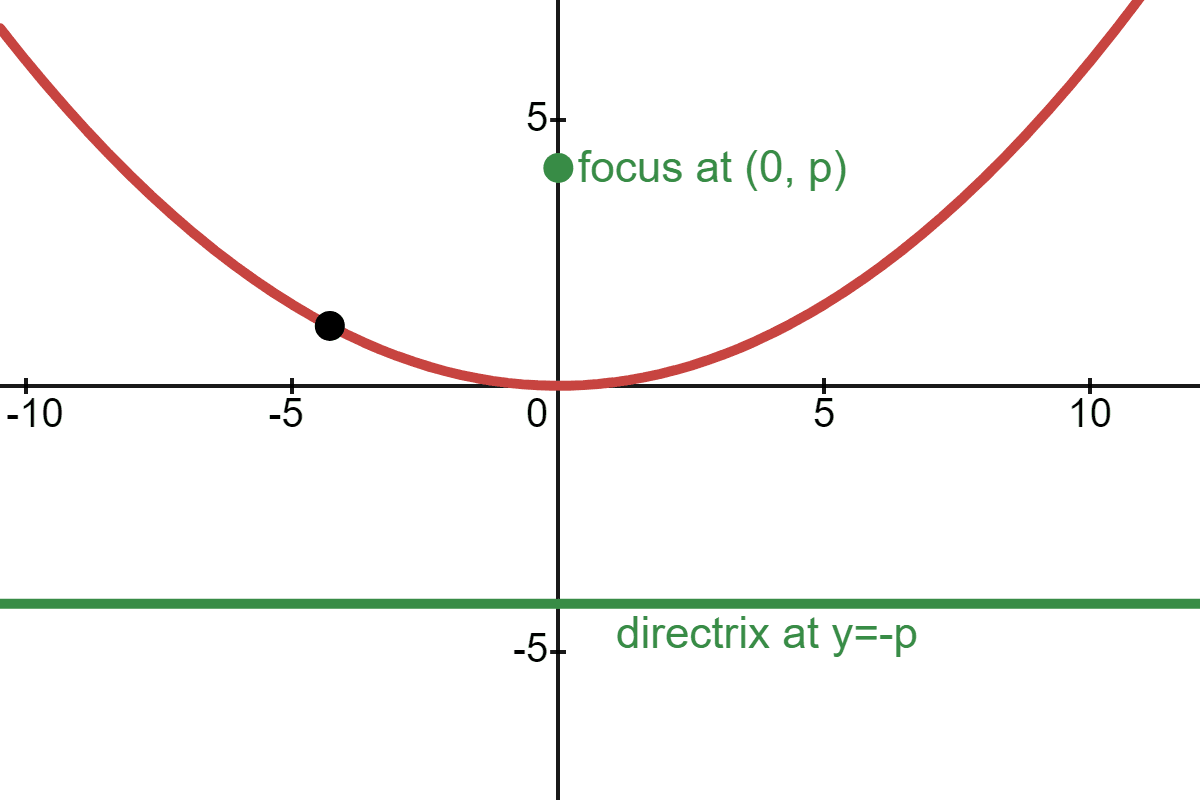 The distance from our point to the focus is equal to the distance from our point to the directrix: