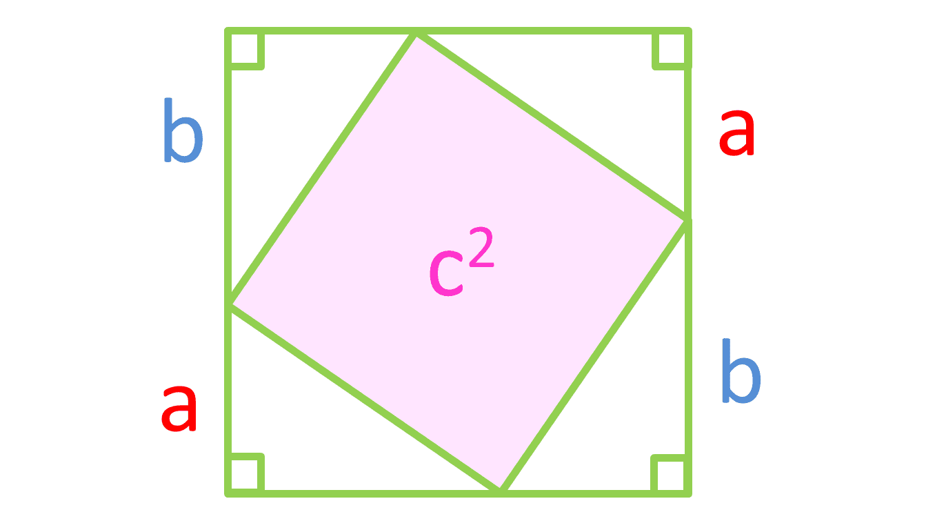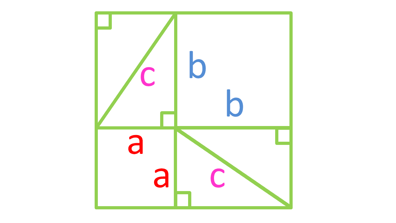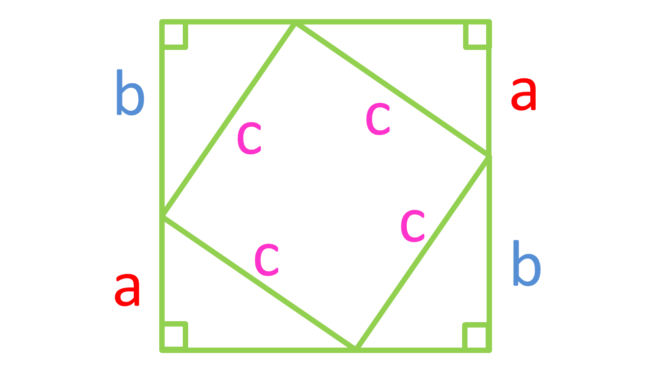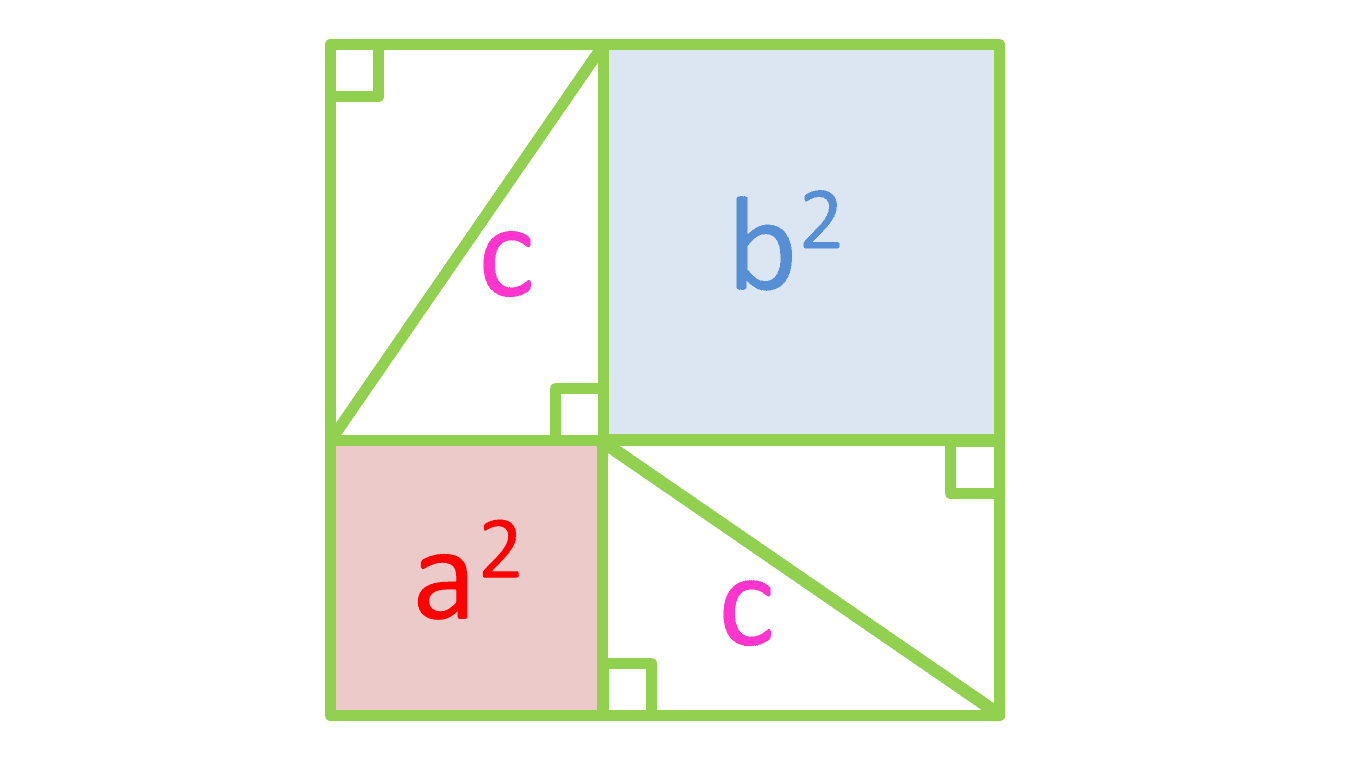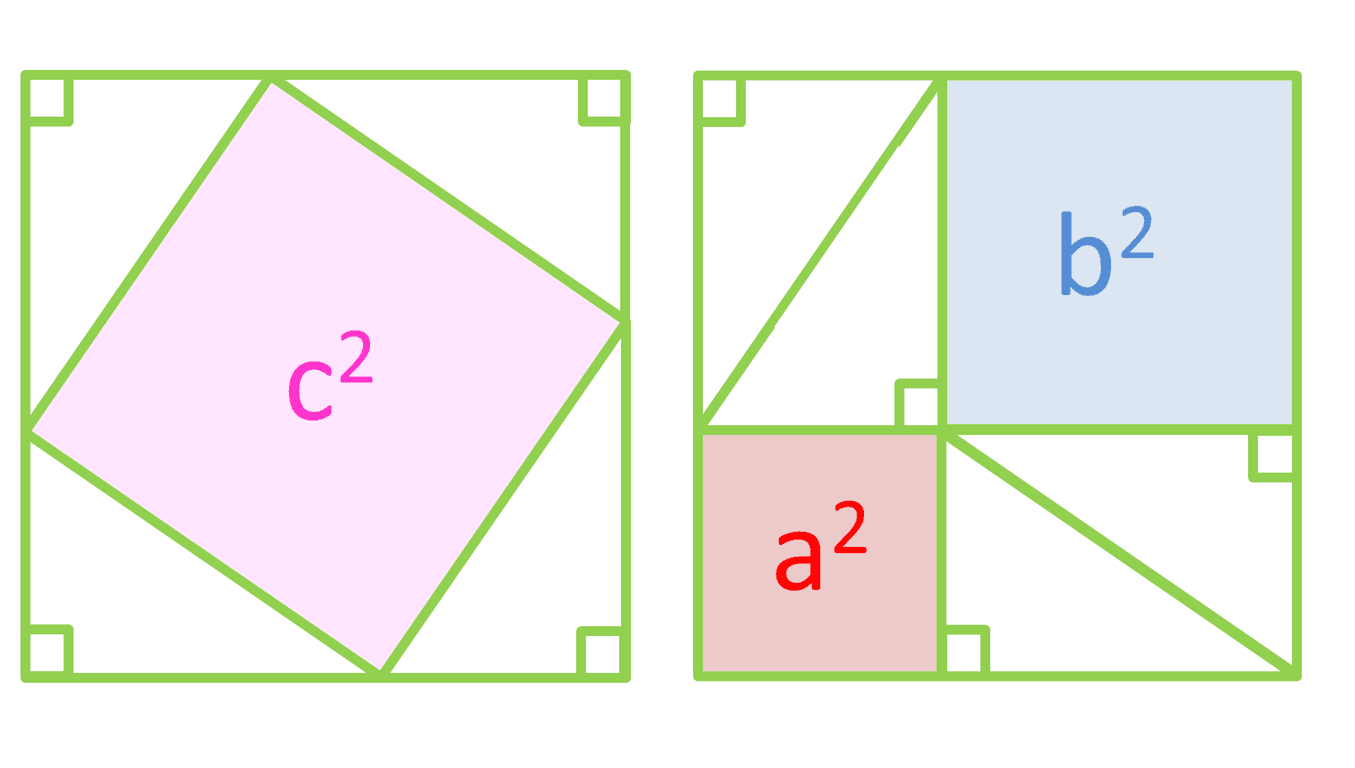 As you can see, both of these squares have length [a + b], the area of the large square and the area of the triangles didn't change, so the remaining area must be equal for both squares, in other words, c2 must be equal to [a2 + b2].