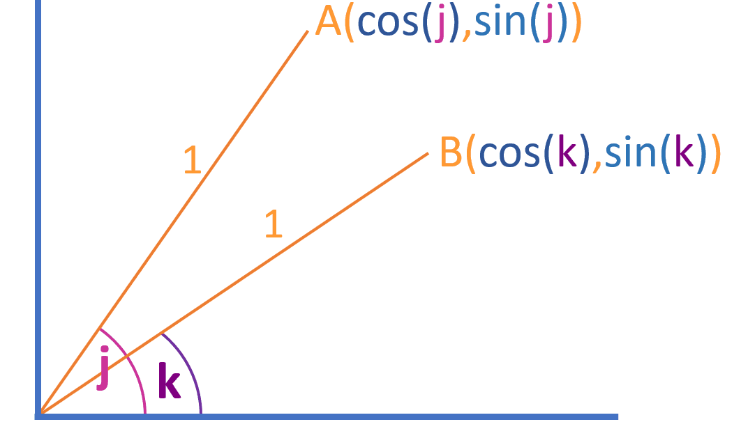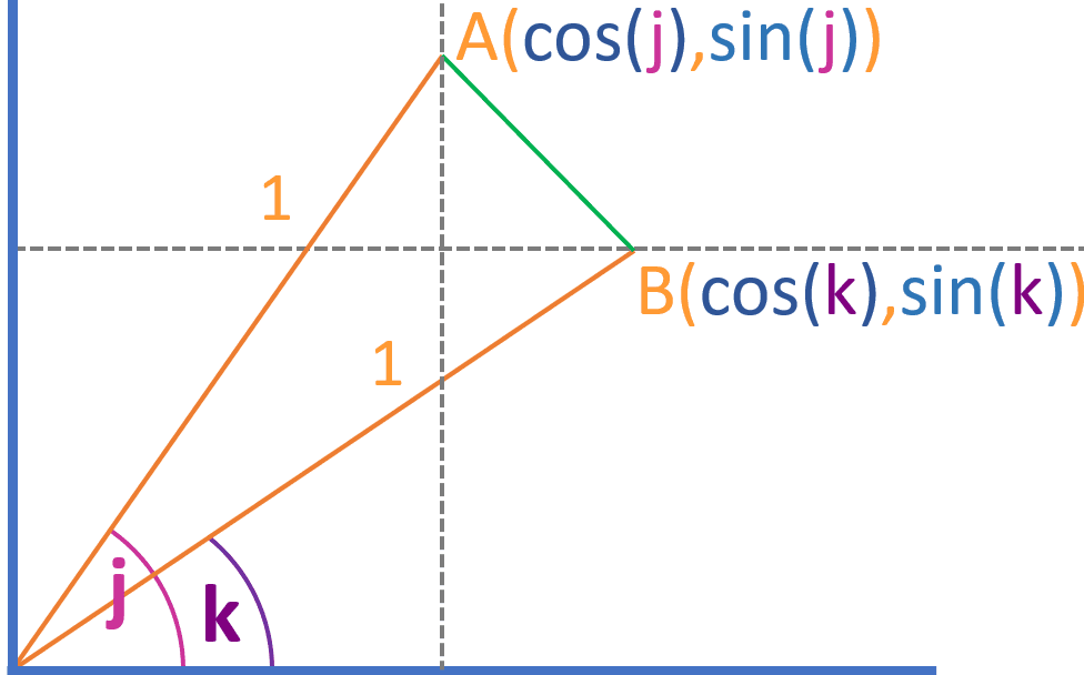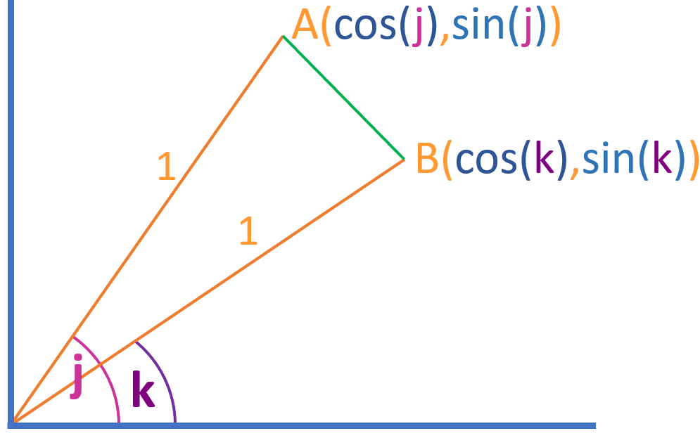 Before reading the proof, you must be familiar with the cosine rule, if not then click here. Imagine two lines with the length of 1, one of them is raised by angle j from the x-axis and the other is raised by angle k. Lets call the end points of the two lines A and B: