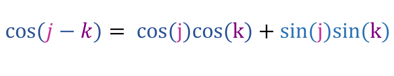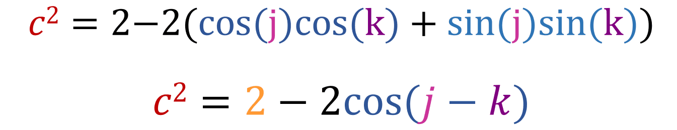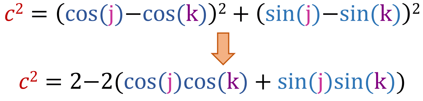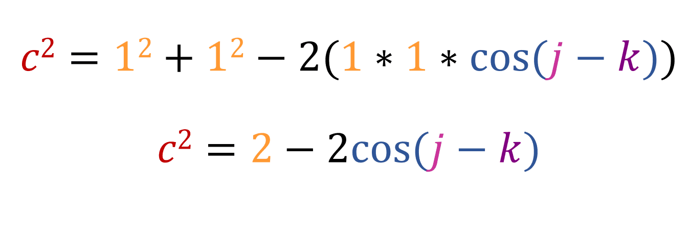 Looking at the graph, we know that the length of the horizontal leg is [cos(k) - cos(j)] and that the length of the vertical leg is [sin(j) - sin(k)], so we can rewrite the above equation as: