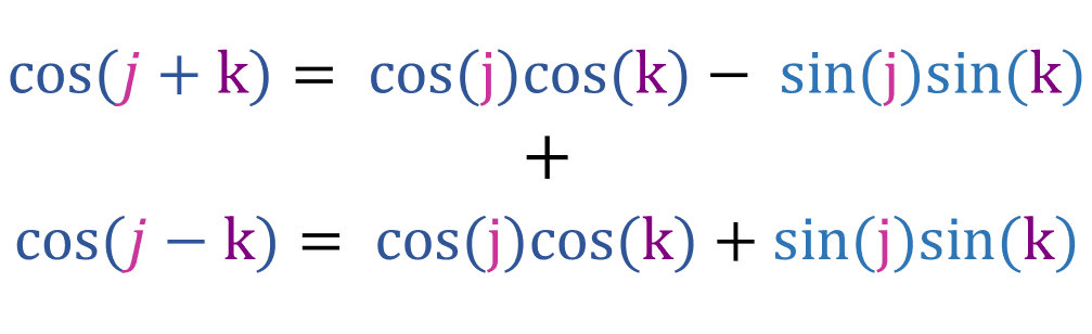 That is the product rule for [sin(j) * cos(k)]. Now suppose I do [cos(j + k) + cos(j - k)]: