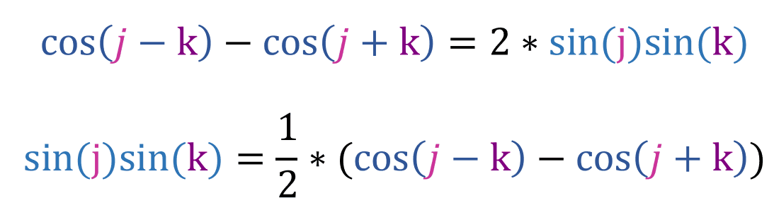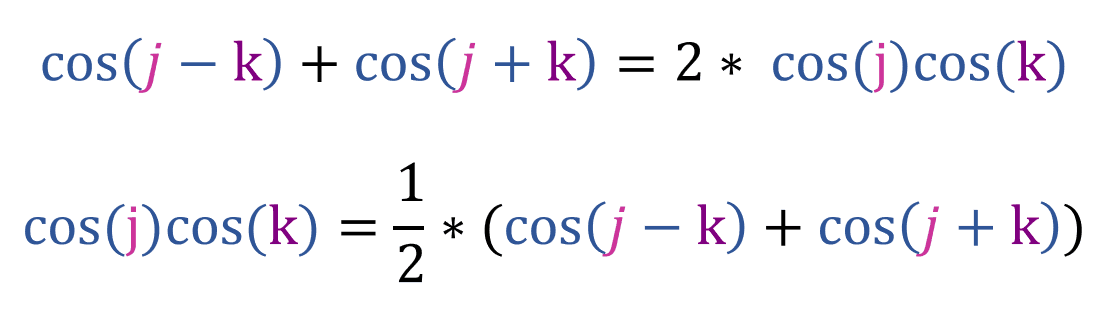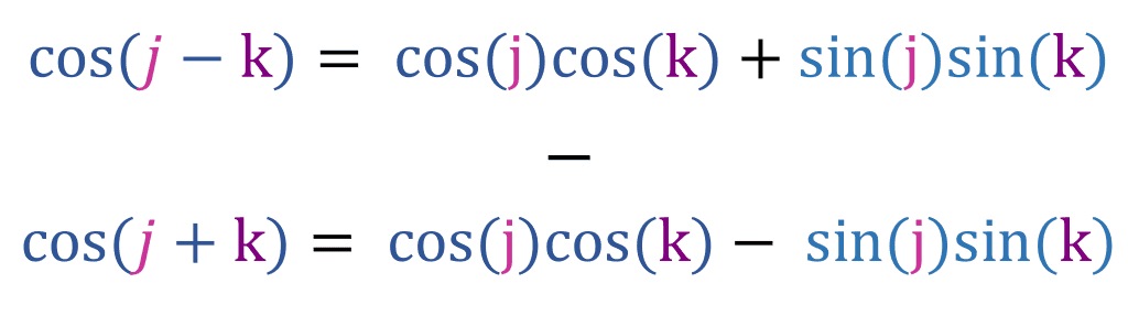 That is the product rule for [cos(j) * cos(k)]. Now suppose I do [cos(j - k) - cos(j + k)]: