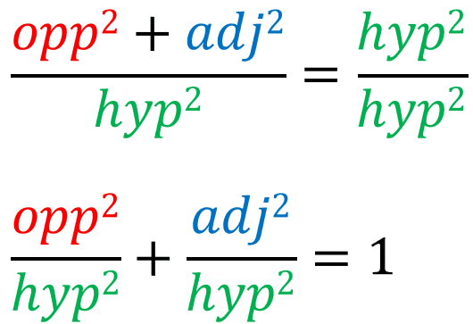 \[ \frac{\text{opp}^2}{\text{opp}^2} + \frac{\text{adj}^2}{\text{opp}^2} = \frac{\text{hyp}^2}{\text{opp}^2} \]