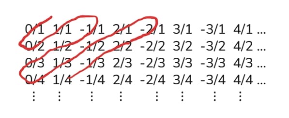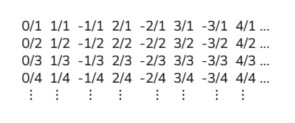 Following the line, the fractions would be listed as so: \(\frac{0}{1}, \frac{0}{2}, \frac{1}{1}, \frac{-1}{1}, \frac{1}{2}, \ldots\). Then, we can remove all the repeated numbers in this list to get \(\frac{0}{1}, \frac{1}{1}, \frac{-1}{1}, \frac{1}{2}, \frac{1}{3}, \frac{-1}{2}, \ldots\). Since this list is one-dimensional, we can associated each number with its position. This gives us a one-to-one coresspondence of each rational number with a natural integer, proving that a set of rational numbers is countable.