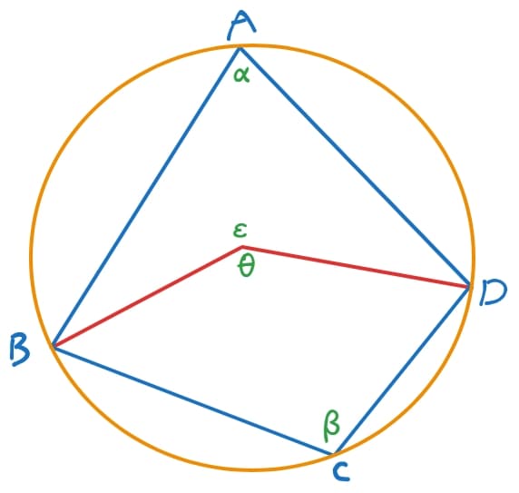 \[\begin{gather} \theta + \epsilon = 2 \alpha + 2\beta = 360 \\ \alpha + \beta = 180 \end{gather} \]